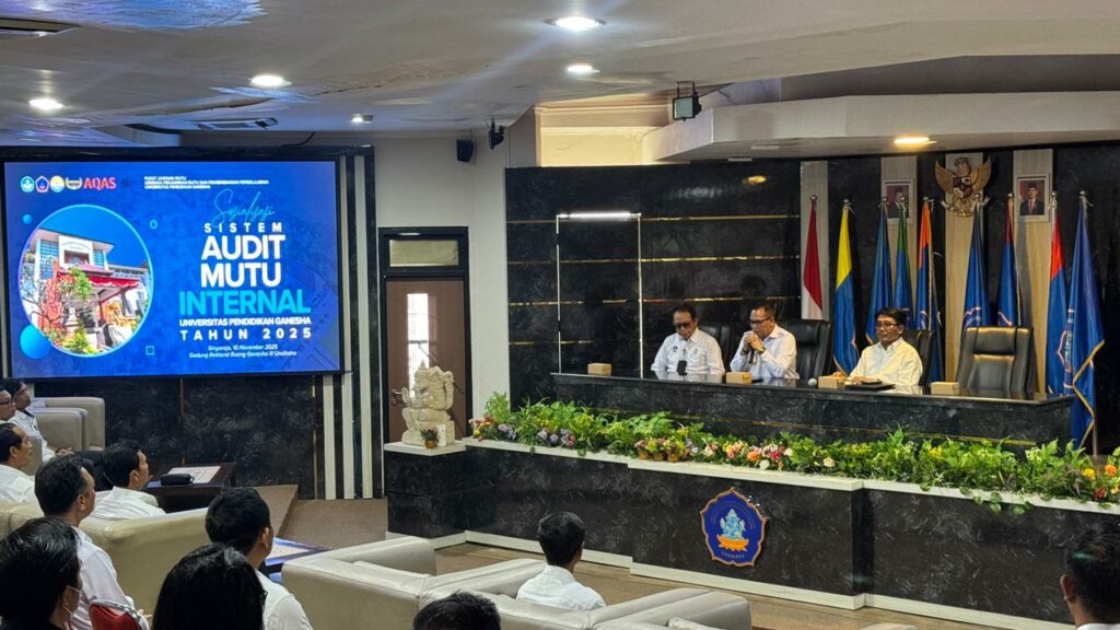 Singaraja, 10 November 2025 – Universitas Pendidikan Ganesha (Undiksha) menggelar kegiatan Sosialisasi Sistem Audit Mutu Internal (AMI) Tahun 2025 yang bertempat di Ruang Ganesha III Gedung Rektorat Undiksha. Kegiatan ini dihadiri oleh pimpinan Universitas, Dekan, Ketua Jurusan, Koordinator Program Studi, serta tim dari Pusat Jaminan Mutu Undiksha.